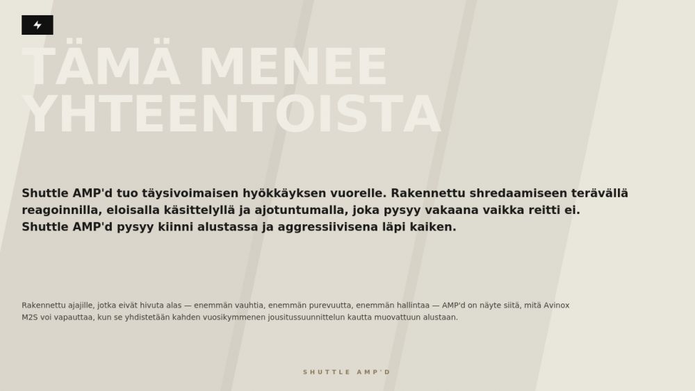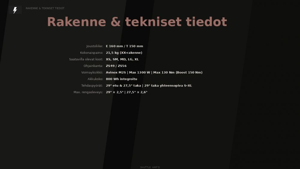 Shuttle AMP’d Pro yhdistää ketterän käsiteltävyyden, aggressiivisen geometrian ja erittäin tehokkaan sähköavustuksen tavalla, joka tekee ajamisesta nopeaa, hallittua ja hauskaa. Pyörä reagoi terävästi ohjaukseen, säilyttää vakautensa kovassa vauhdissa ja pitää ajolinjan tarkkana myös kivikoissa, juurakoissa ja jyrkemmissä laskuissa. Se on sähkömaastopyörä, joka tuntuu elävältä ja leikkisältä, mutta samalla poikkeuksellisen varmalta silloin, kun reitti muuttuu rajummaksi.
