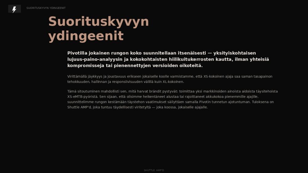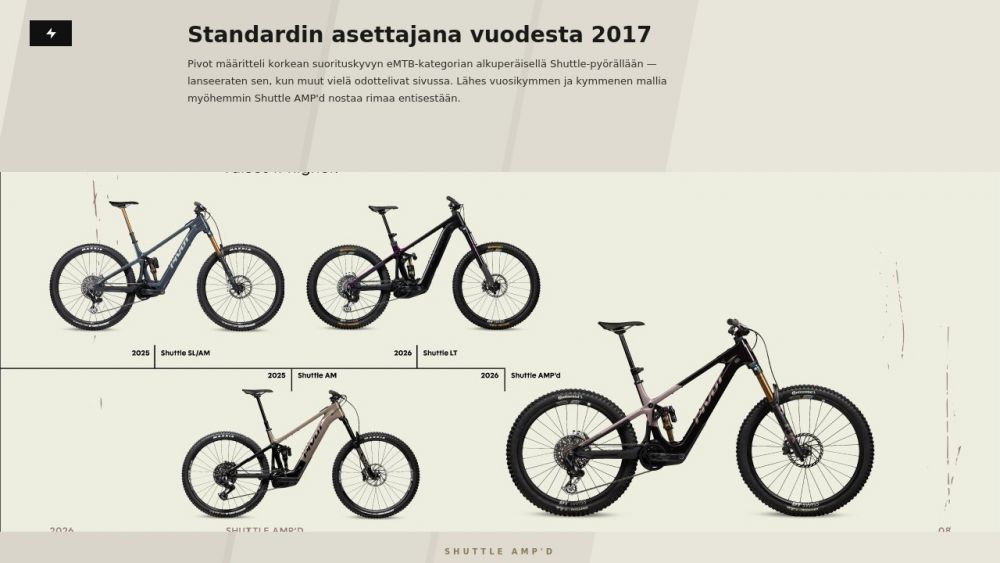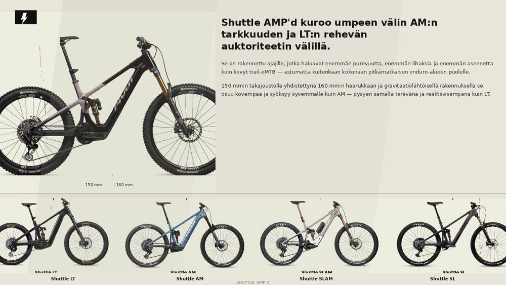 Pivot Shuttle AMP’d Pro on tehokas täysjousto sähkömaastopyörä ajajalle, joka haluaa enemmän voimaa, enemmän vakautta ja enemmän suorituskykyä vaativaan trail- ja endurohenkiseen maastoajoon. Se on suunniteltu kuskille, joka hakee kevyttä trail-eMTB:tä enemmän iskukykyä ja alamäkivarmuutta, mutta ei halua siirtyä täysin raskaan ja pitkäjoustoisen endurosähköpyörän maailmaan.