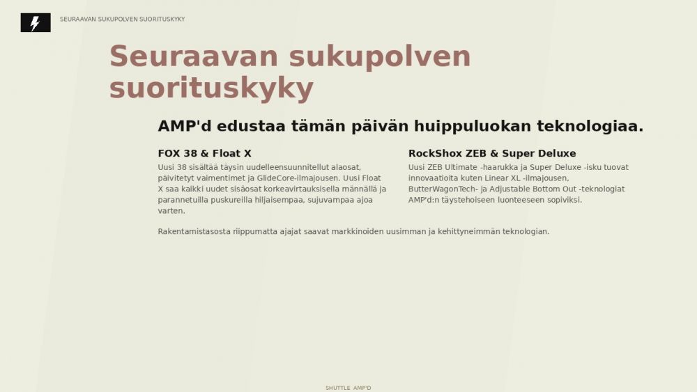 Zeb Ultimate on tunnettu jäykästä rakenteestaan, tarkasta ohjattavuudestaan ja kyvystään säilyttää hallinta kovassa kuormituksessa. Super Deluxe Ultimate puolestaan täydentää kokonaisuutta tarjoamalla takapäähän herkkyyttä, tukea ja tasapainoa, joiden ansiosta Shuttle AMP’d Pro pysyy rauhallisena ja ennakoitavana myös aggressiivisessa ajossa. Yhdessä nämä tekevät pyörästä erittäin suorituskykyisen vaihtoehdon kuljettajalle, joka haluaa sähkömaastopyörältä huipputason jousitustuntumaa.