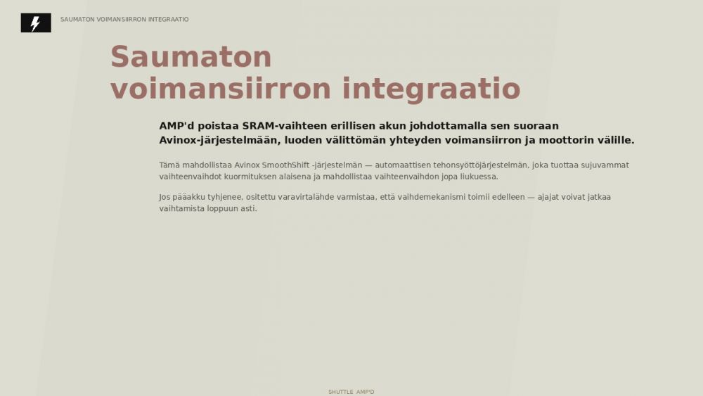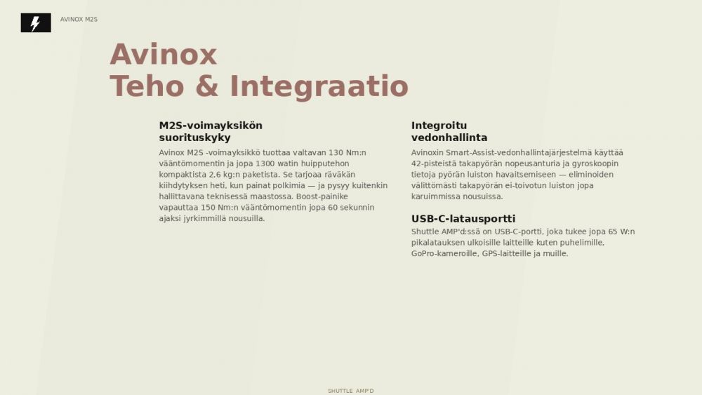 Shuttle AMP’d Pron voimanlähteenä toimii Avinox M2S -moottori, joka tuottaa jopa 150 Nm vääntöä ja jopa 1300 watin huipputehon kompaktista 2,6 kg:n kokonaisuudesta. Teho tuntuu välittömästi polkimelle astuttaessa, mutta pysyy silti hallittavana myös teknisessä maastossa. BOOST-toiminto vapauttaa täyden tehon jopa 60 sekunnin ajaksi silloin, kun nousu jyrkkenee tai tarvitaan maksimaalista lisäpotkua.