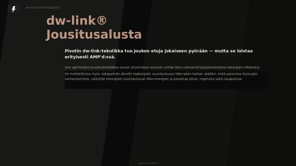 150 mm:n takajousto, 160 mm:n etuhaarukka ja painovoimavaikutteinen kokonaisuus tekevät Shuttle AMP’d Prosta valmiin kovaan ajoon. Pivotin dw-link®-jousitus tunnetaan tehokkaasta poljettavuudestaan, erinomaisesta pidosta ja kyvystään pitää takapyörä aktiivisena vaikeassa maastossa. Lopputuloksena on alusta, joka kiihtyy tehokkaasti, säilyttää vetopidon nousuissa ja tarjoaa hallitun, herkän ja vauhtia tukevan tuntuman alamäissä.